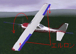 傾けると、左のエルロンが上がると同時に、右のエルロンが下がります。